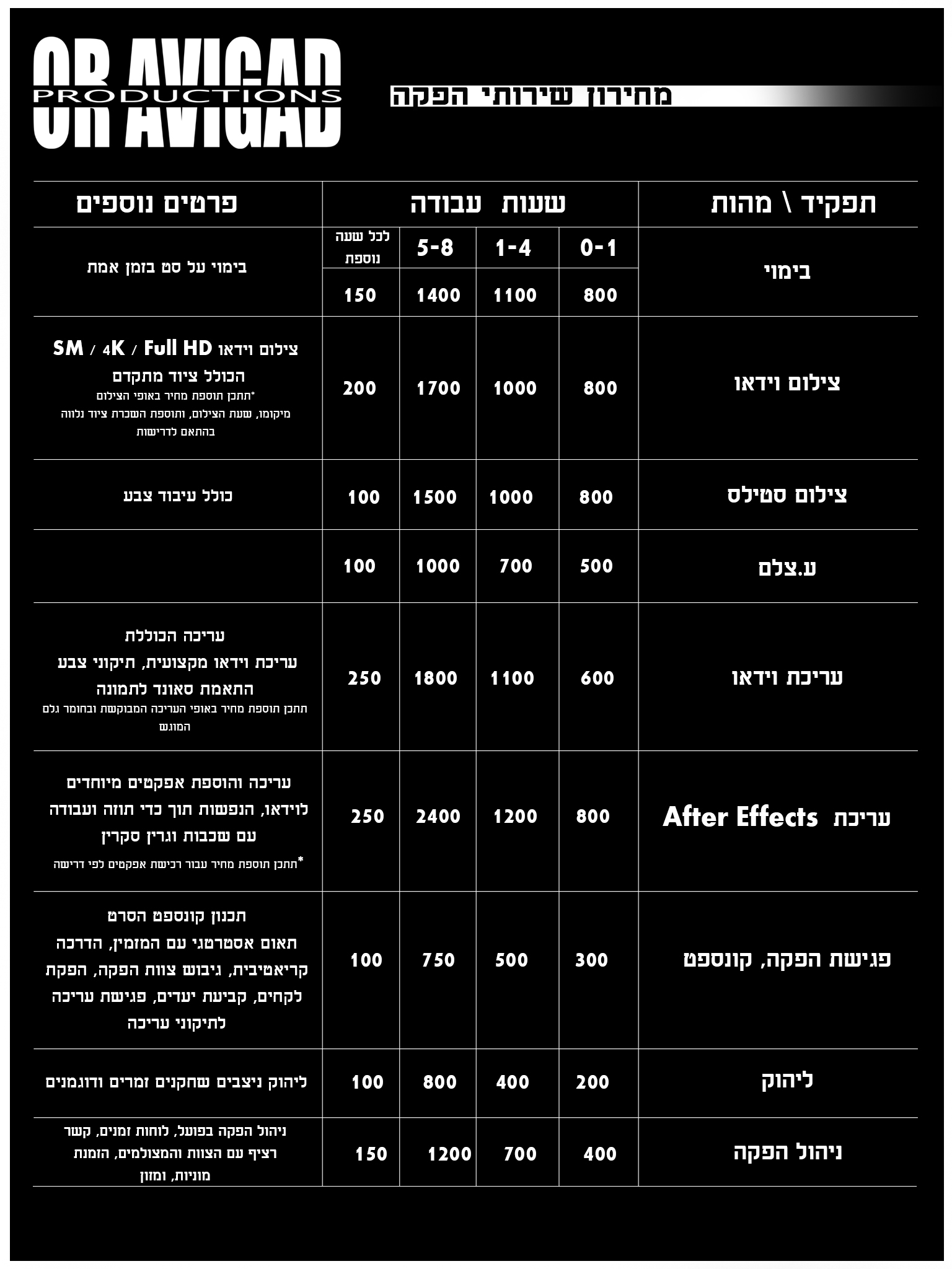 מחירון הפקות וידאו